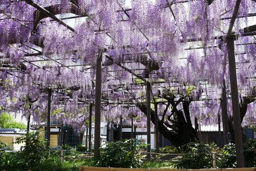 岐阜県羽島市にある竹鼻別院のフジが見頃になってきました。 今年はお祭り的なことは中止ですが、フジの鑑賞は普通にできます。 竹鼻別院のフジを鑑賞するのは4年ぶり。 久々に薄紫色のシャワーを浴びて気持ち良かったです。 樹齢300年以上の古木。 円熟の幹…